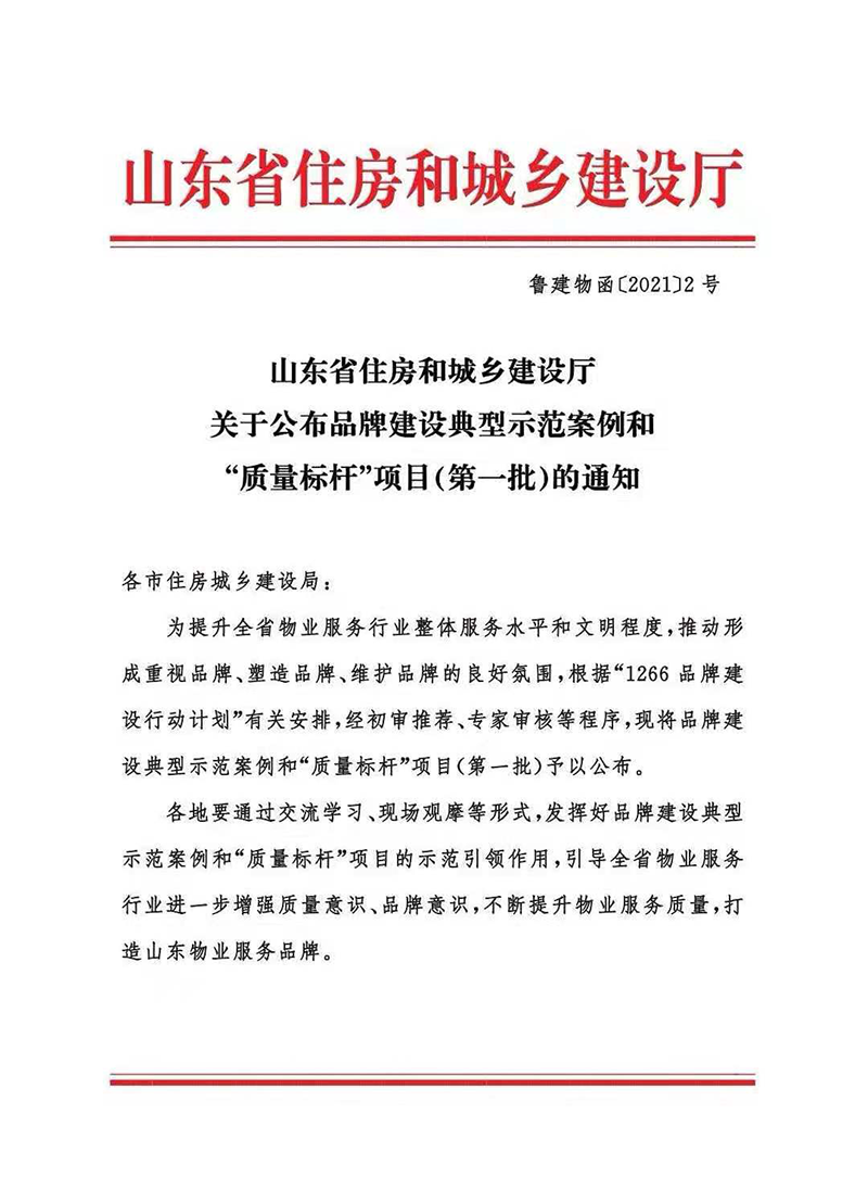 4月19日,山東省住房和城鄉(xiāng)建設廳發(fā)布通知,公布品牌建設典型示范案例和“質量標桿”項目(第一批),濰坊昌大物業(yè)管理有限公司泰和東郡小區(qū)被評為“質量標桿”物業(yè)項目。