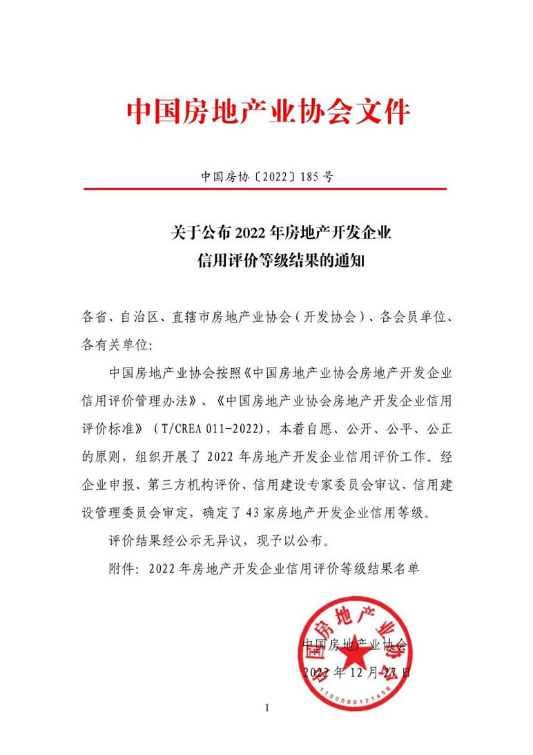 2022年12月27日,中國房地產(chǎn)業(yè)協(xié)會公布了2022年全國房地產(chǎn)開發(fā)企業(yè)信用評價等級結(jié)果,全國43家房地產(chǎn)開發(fā)企業(yè)經(jīng)嚴格、公正評審后獲評信用等級。集團泰和置業(yè)榮獲此次信用評價的最高等級——AAA級,這也是泰和置業(yè)繼2016年、2019年獲評AAA級后,再次獲得國家權(quán)威機構(gòu)的肯定。