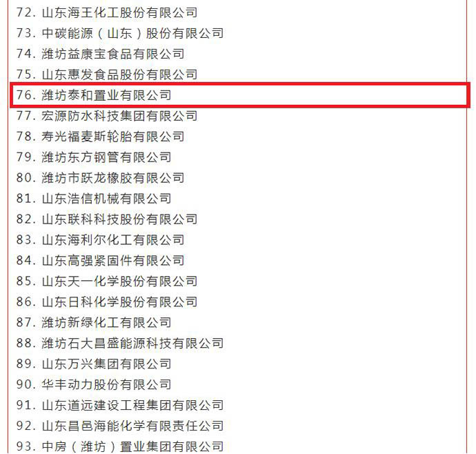 2023年1月1日,濰坊工商聯(lián)發(fā)布了2022濰坊民營企業(yè)100強(qiáng)系列榜單,濰坊泰和置業(yè)有限公司同時斬獲“濰坊民企百強(qiáng)、社會責(zé)任50強(qiáng)”兩項榮譽(yù)。