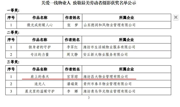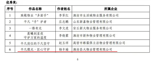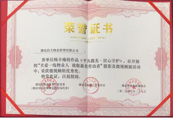 2025年5月30日,在全市物業(yè)行業(yè)“關(guān)愛(ài)一線物業(yè)人 致敬最美勞動(dòng)者”攝影及微視頻展活動(dòng)中,濰坊昌大物業(yè)管理有限公司提報(bào)的兩部作品雙雙獲獎(jiǎng)!《肩上的春天》榮獲三等獎(jiǎng),《平凡微光·匠心守護(hù)》榮獲優(yōu)秀獎(jiǎng),這份雙重榮譽(yù),是對(duì)昌大物業(yè)企業(yè)文化的生動(dòng)詮釋?zhuān)菍?duì)全體物業(yè)人敬業(yè)精神的崇高禮贊!