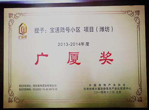 ? ? ? ?2014年12月5日,國務院批準設立的國家級房地產業(yè)綜合性大獎——國家“廣廈獎”頒獎典禮在北京隆重舉行。濰坊泰和置業(yè)有限公司開發(fā)的“寶通陸號”小區(qū),在眾多參評項目中脫穎而出,榮膺此項殊榮。這是房地產行業(yè)內最權威和房地產項目的最高榮譽。集團此項榮譽的獲得也填補了濰坊中心城區(qū)在獎項上的歷史空白,實現(xiàn)了零的突破。