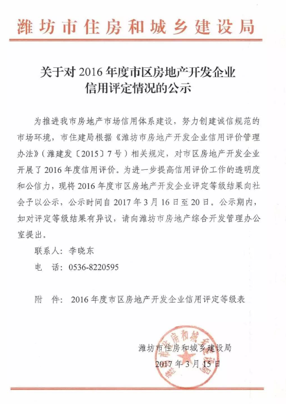近日,濰坊市住房和城鄉(xiāng)建設(shè)局發(fā)布《關(guān)于對(duì)2016年度市內(nèi)房地產(chǎn)開發(fā)企業(yè)信用等級(jí)評(píng)價(jià)結(jié)果的通報(bào)》,濰坊泰和置業(yè)有限公司 等28家企業(yè)信用評(píng)價(jià)獲評(píng)AAA級(jí)。